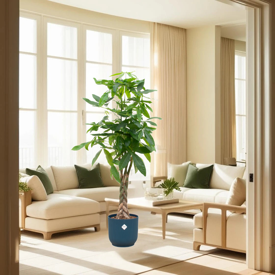 Pachira Aquatica inclusief elho Vibes Fold Round blauw Ø30 - 150 cm
