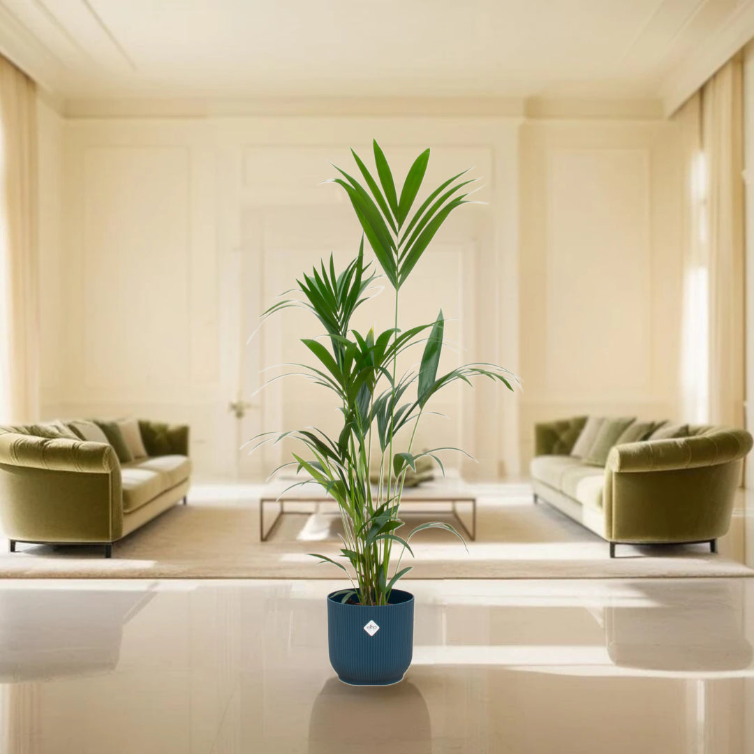 Kentia palm inclusief elho Vibes Fold Round blauw - 160cm - Ø30
