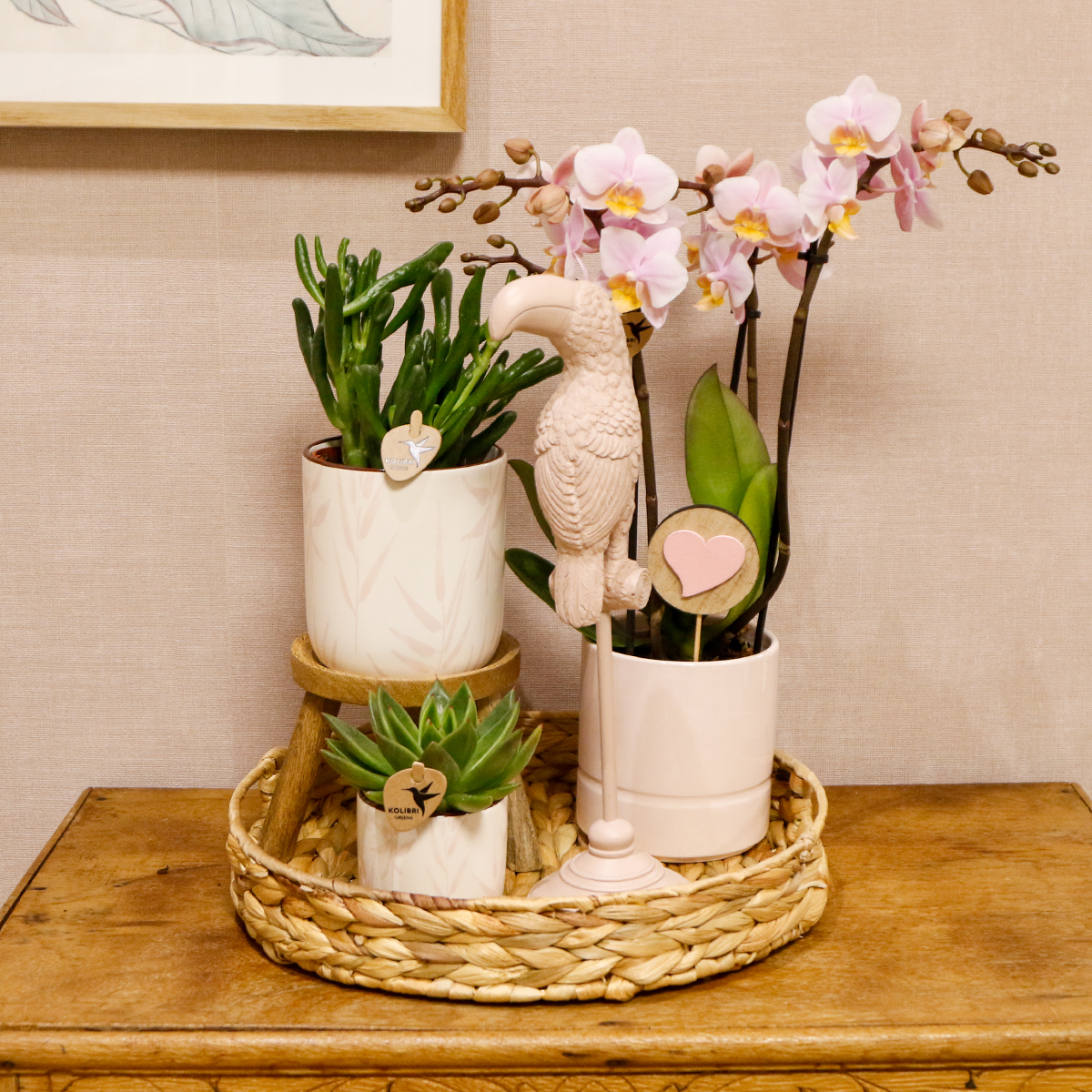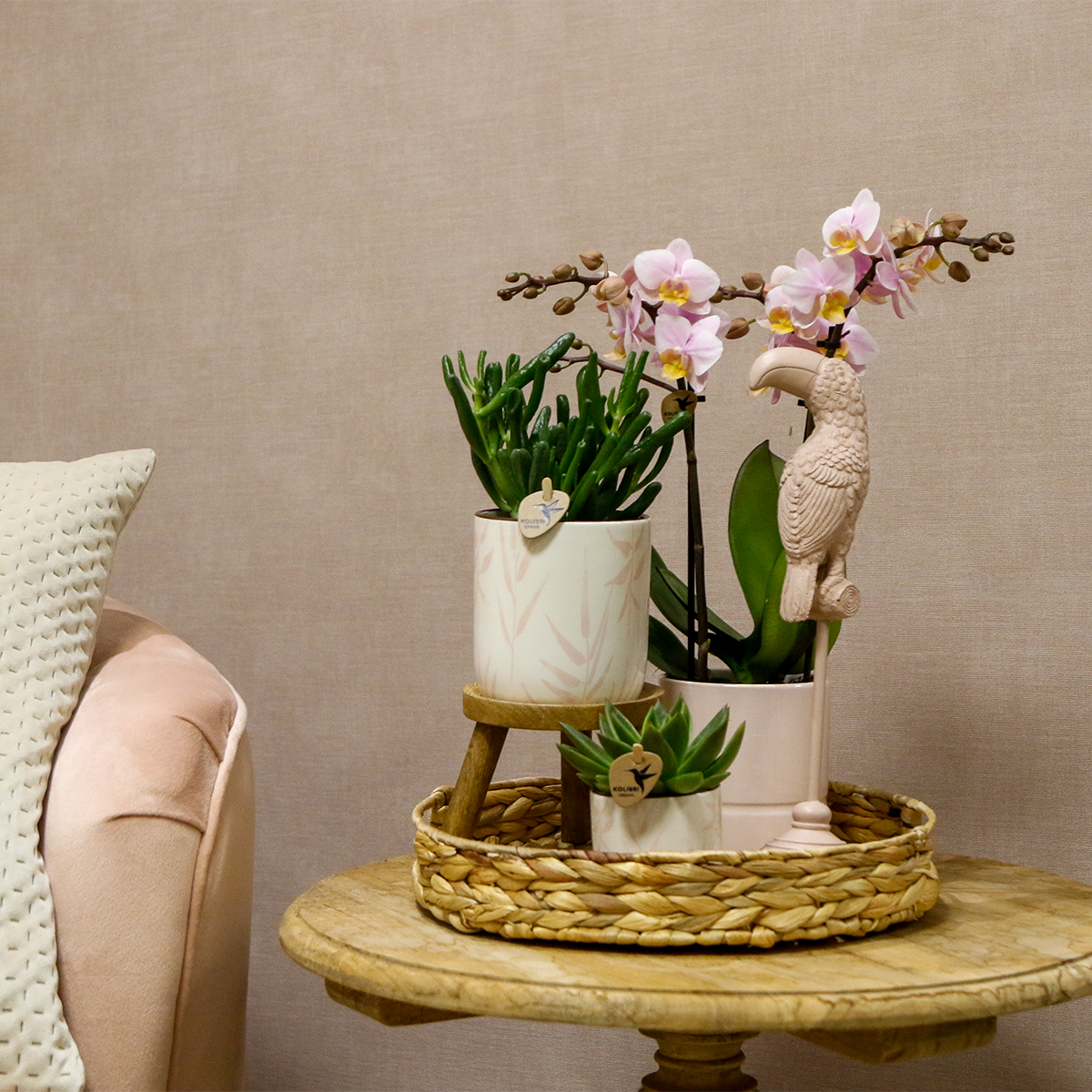 Ben jij op zoek naar een liefdevol cadeau of is het tijd om een jubileum te vieren? Met deze complete plantenset slaat de vonk zeker over. In de set staat de prachtige roze orchidee Andorra met daarnaast twee groene planten. Alle planten staan in roze sierpotten met duurzame afwerking en een licht spikkelend patroon. Om een speelse set te maken, staat er één groene plant op een houten verhoging. De roze orchidee geeft 2 van 3 takken en heeft een potmaat van 9 cm. Alle producten staan op een bamboe dienblad.