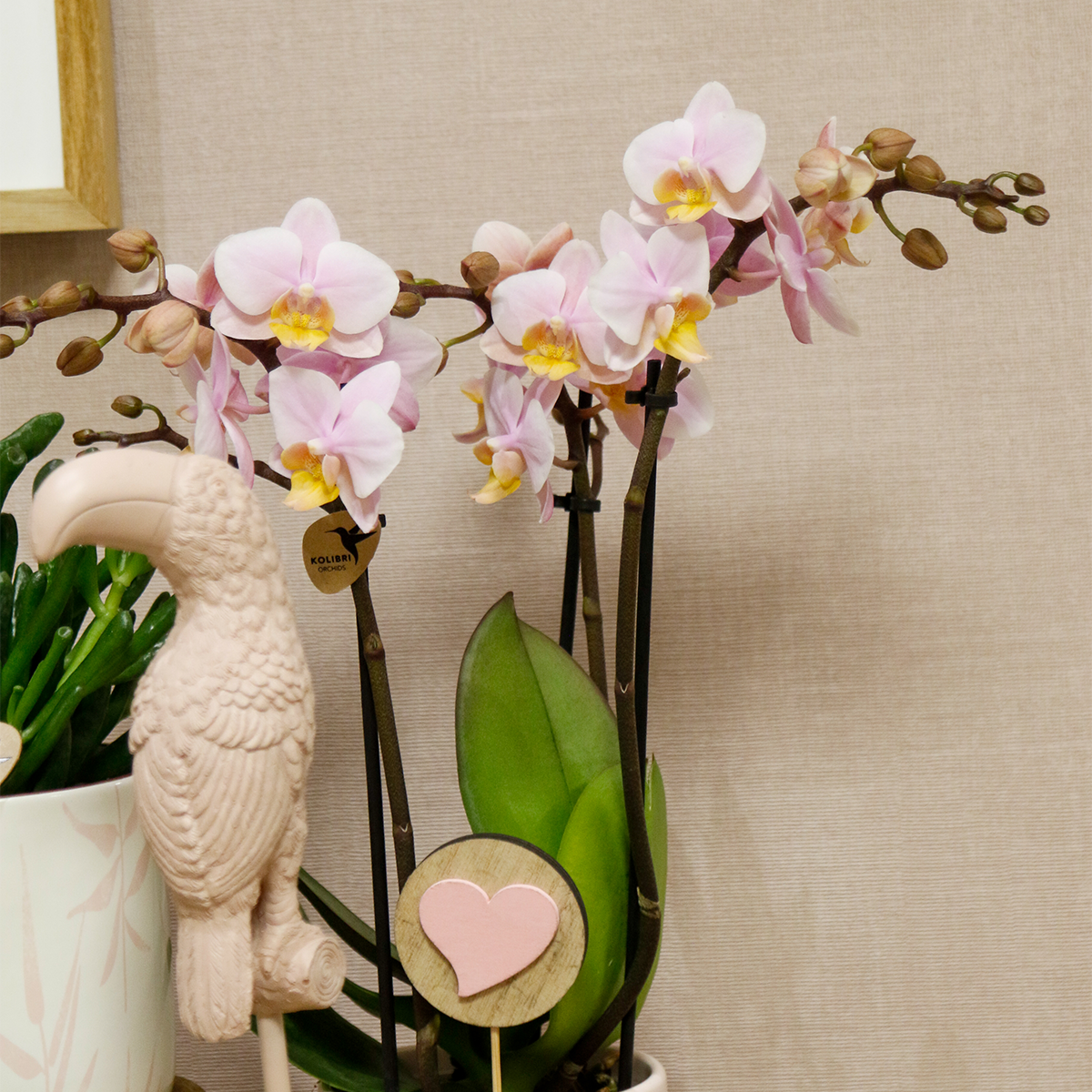 De orchidee wordt geleverd met 2 van 3 stevige takken, afhankelijk van de actuele beschikbaarheid. Omdat we levende producten werken, kunnen er kleine variaties zijn in het aantal takken van bloemen.