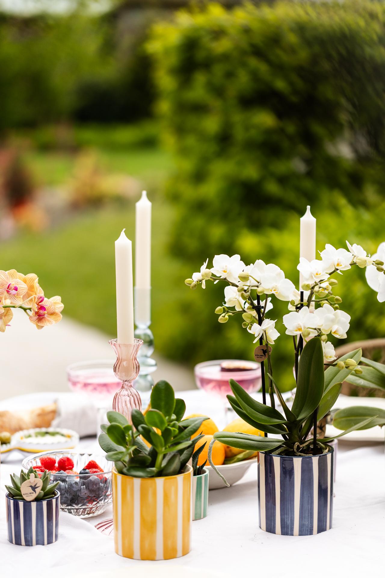 Ben je binnenkort van plan een diner te organiseren? Hoe leuk is deze set van verschillende groene planten met Painted Stripe potten in diverse kleuren voor jouw tafelaankleding? Breng een vrolijke, zonnige sfeer op tafel met de Painted Stripe sierpotten. Deze set van 6 sierpotten, gevuld met de mooiste groene planten, komt in twee potmaten - 6 cm en 9 cm. Je ontvangt van beiden potmaten 3 potten zodat je de hele tafel kunt vol zetten met groen geluk. Een zomers tafereel!