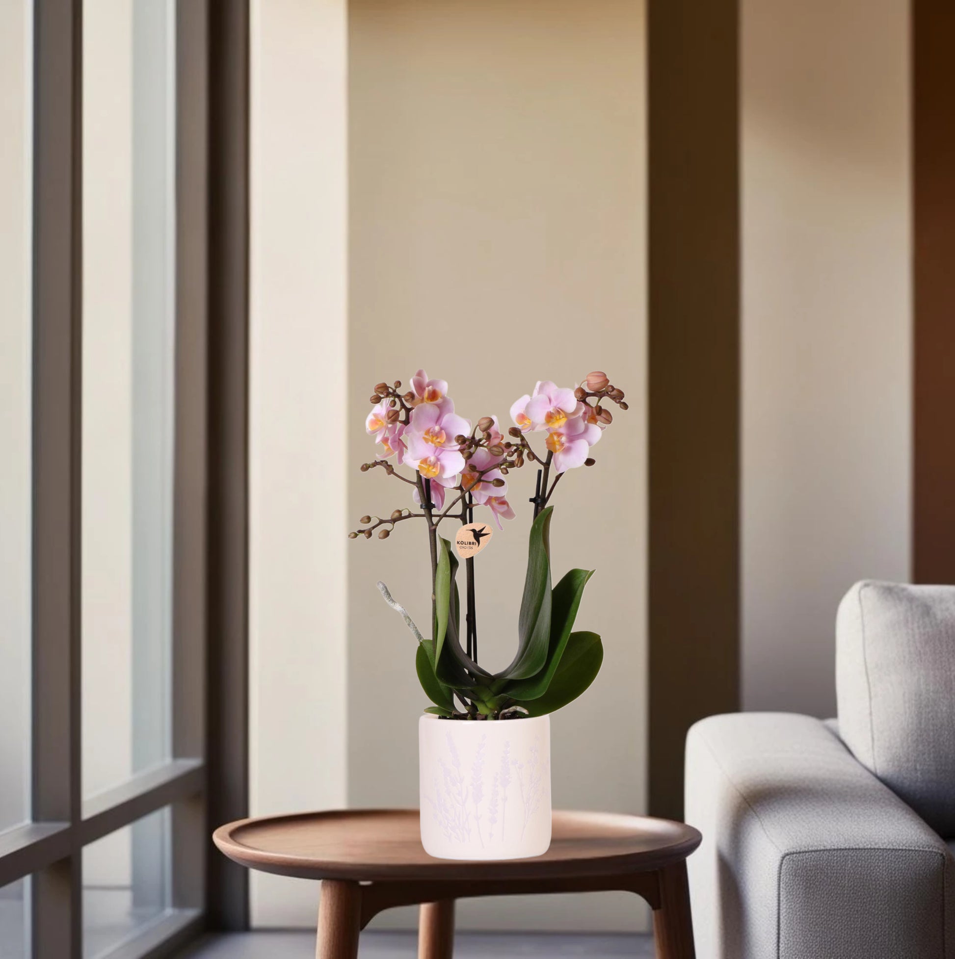 Roze orchidee Andorra + Floral sierpot lavendel - potmaat Ø9cm