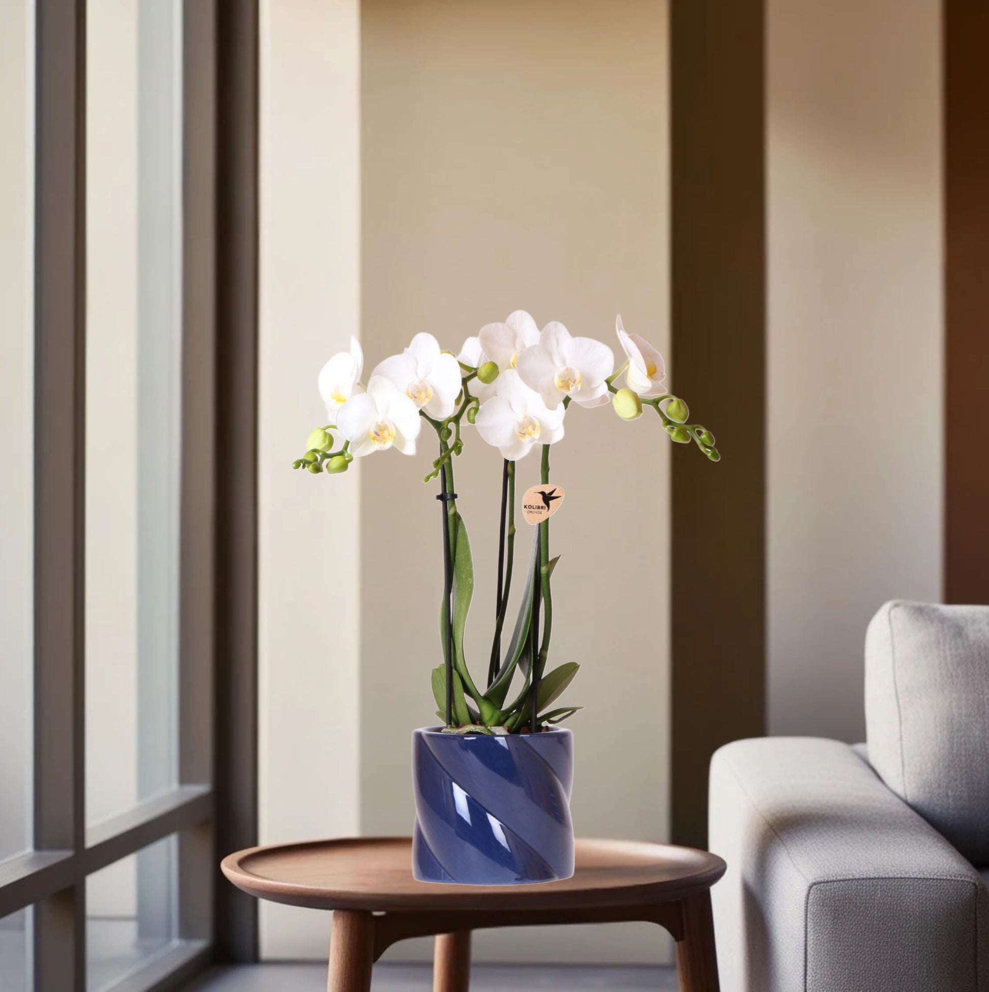 Witte orchidee Amabilis + Candy sierpot blauw - potmaat Ø9cm