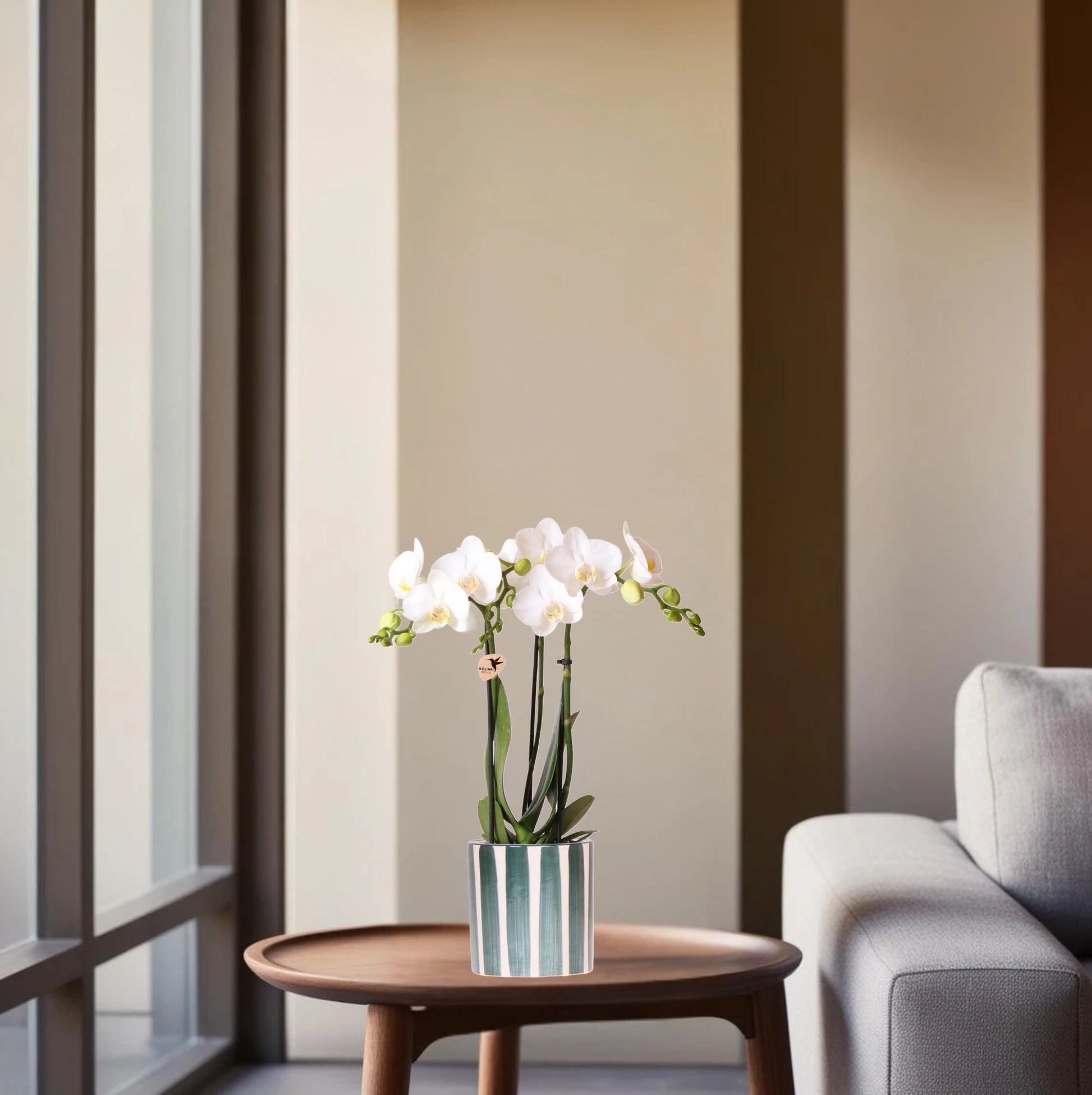 De witte Phalaenopsis orchidee Amabilis staat bekend om haar grote, zuiver witte bloemen die elke ruimte oplichten. In combinatie met de stijlvolle groene Painted Stripe pot, met zijn speelse en toch verfijnde streeppatroon, creëer je een echte blikvanger in je huis.