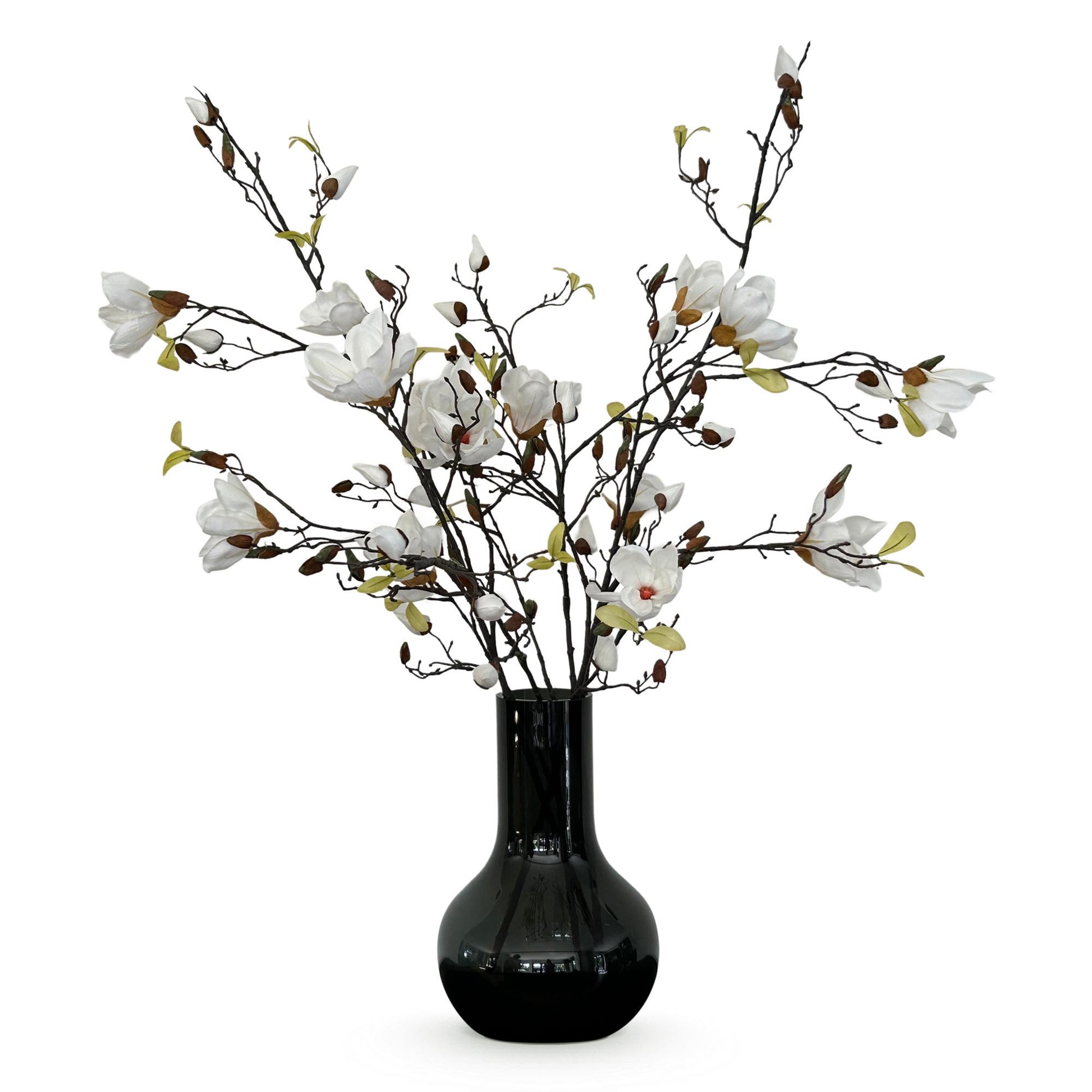 Soms kan het zo simpel zijn. Zet een paar kunst magnolia takken in een bijzondere vaas en je hebt gewoon een kunststukje gemaakt. Met deze creatie geef je elke ruimte een upgrade! De mooie kunst magnola takken zijn van hele goede kwaliteit en je kunt er onzichtbaar van genieten. Niemand ziet dat ze niet echt zijn. De kunst magnolia heeft een serene witte kleur die overal is verleden en niet snel verveelt. De takken zijn 105 centimeter lang en je kunt ze afknippen tot elke lengte. Het geeft een leuk speeleffect om de kunsttakken in verschillende lengtes te presenteren in een van onze mooie vazen.