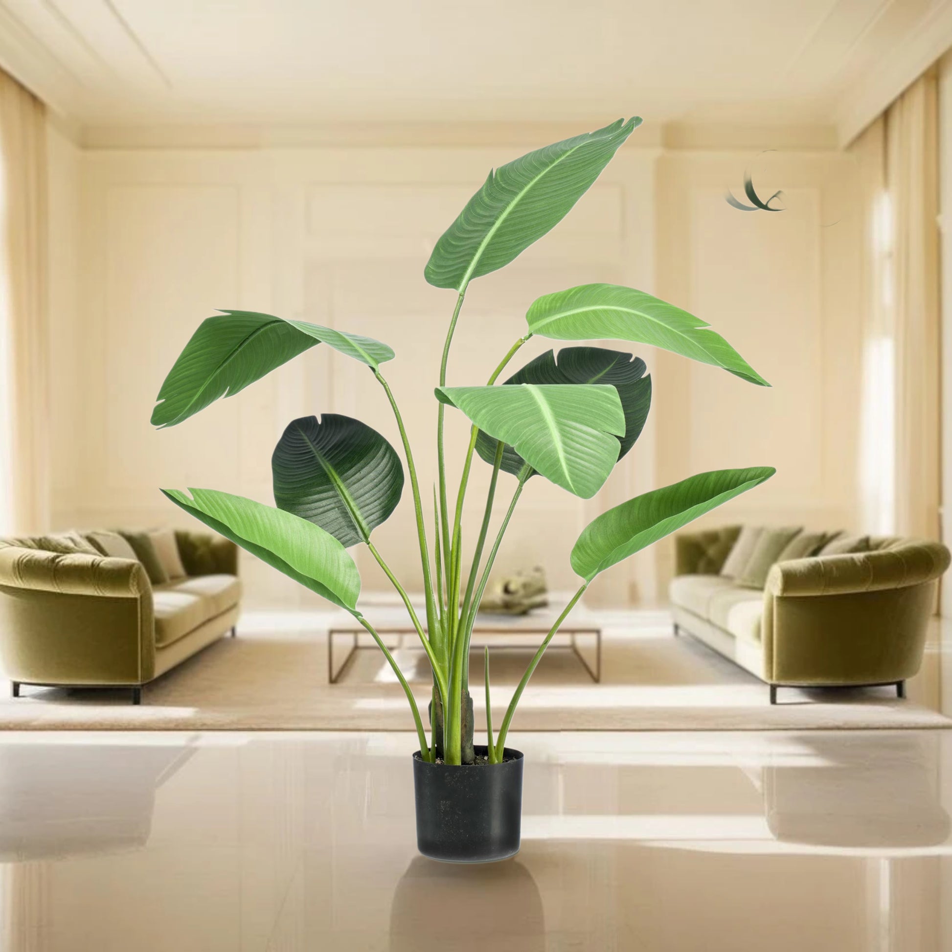 De Strelizia is een prachtige plant die vrij moeilijk in leven te houden is in het Nederlandse klimaat. Daarom kun je waarschijnlijk beter deze kunst Strelizia aanschaffen. Je zult nauwelijks verschil merken want met zijn mooie zijden bladeren geeft hij een ‘net echt’ gevoel. Eigenlijk best een duurzame keuze dus als je erover nadenkt. De Nederlandse naam Paradijsvogelbloem komt van de schitterende bloemen die in de tropen groeien aan de Strelizia. Met paars en oranje lijken ze wel op vogels. In de Nederlandse huiskamers bloeit de Paradijsvogelbloem niet, dus ook onze kunst Strelizia wordt zonder bloemen geleverd. De grote bladeren zijn een genot op zich.