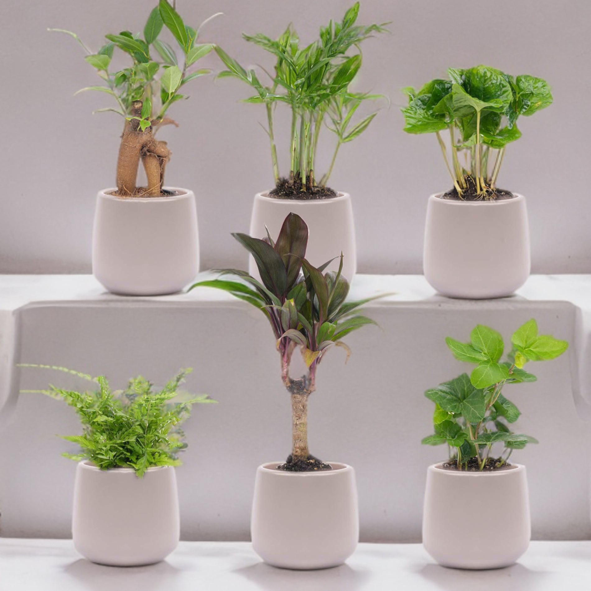 Het ronde ontwerp zorgt voor een zachte uitstraling, terwijl het praktische formaat ideaal is voor kleinere planten. Gebruik het potje solo of combineer meerdere potjes voor een harmonieus geheel in je woonkamer, keuken of zelfs kantoor. Deze set bevat zes prachtige planten: Hedera Helix, Varen, Coffea Arabica, Bergpalm, Ficus Ginseng Bonsai en een Mini-Palm. Samen met de stijlvolle potjes brengen ze sfeer en leven in huis.