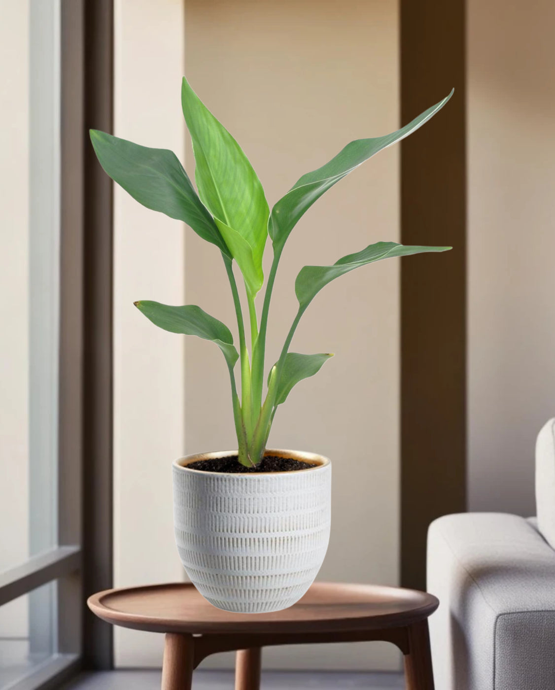 De Strelitzia Reginae, beter bekend als de Paradijsvogelplant, is een indrukwekkende kamerplant met grote, glanzende bladeren die een tropische uitstraling geven. Deze plant staat bekend om zijn robuuste groei en unieke, waaierachtige bladstructuur. Hoewel hij binnenshuis zelden bloeit, staat hij symbool voor luxe en elegantie en is hij een stijlvolle toevoeging aan elk interieur.